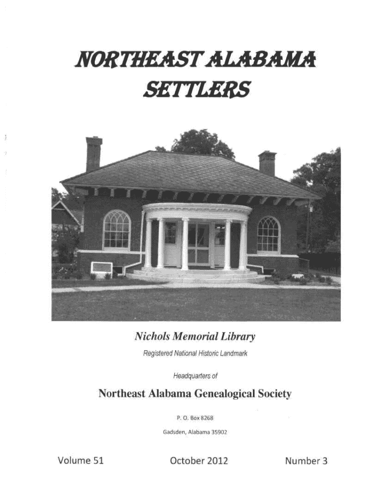 NORTHEASTALABAMA SETTLERS Nichols Memorial Library Registered National Historic LandmarkHeadquarters of Northeast Alabama Genealogical Society P. 0. Box 8268 Gadsden, Alabama 35902Volume 51October