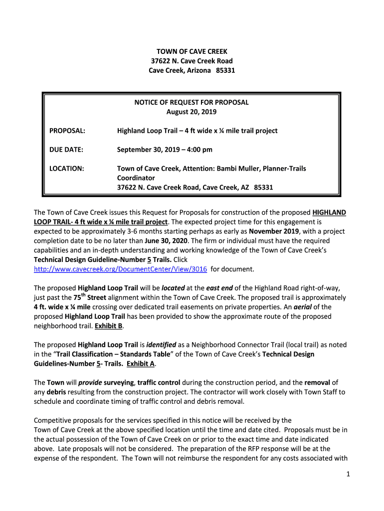 TOWN OF CAVE CREEK 37622 N. Cave Creek Road Cave Creek, Arizona 85331NOTICE OF REQUEST FOR PROPOSAL August 20, 2019, PROPOSAL:Highland Loop Trail 4 ft wide x mile trail projectile DATE:September 30,
