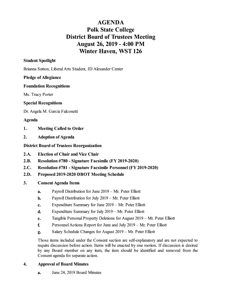 AGENDA Polk State College District Board of Trustees Meeting August 26, 2019 4:00 PM Winter Haven, WST 126 Student Spotlight Brianna Sutton, Liberal Arts Student, JD Alexander Centerpiece of Allegiance