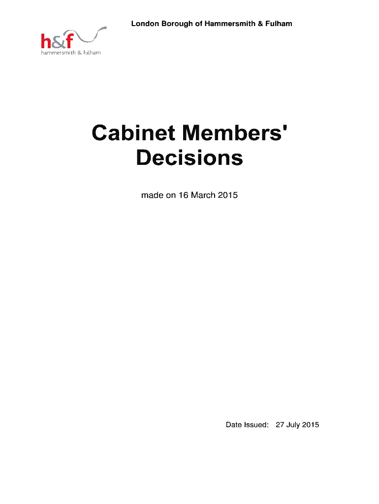 London Borough of Hammersmith & FulhamCabinet Members Decisions made on 16 March 2015Date Issued: 27 July 2015London Borough of Hammersmith & FulhamCabinet Members Decisions made on 16 March 2015