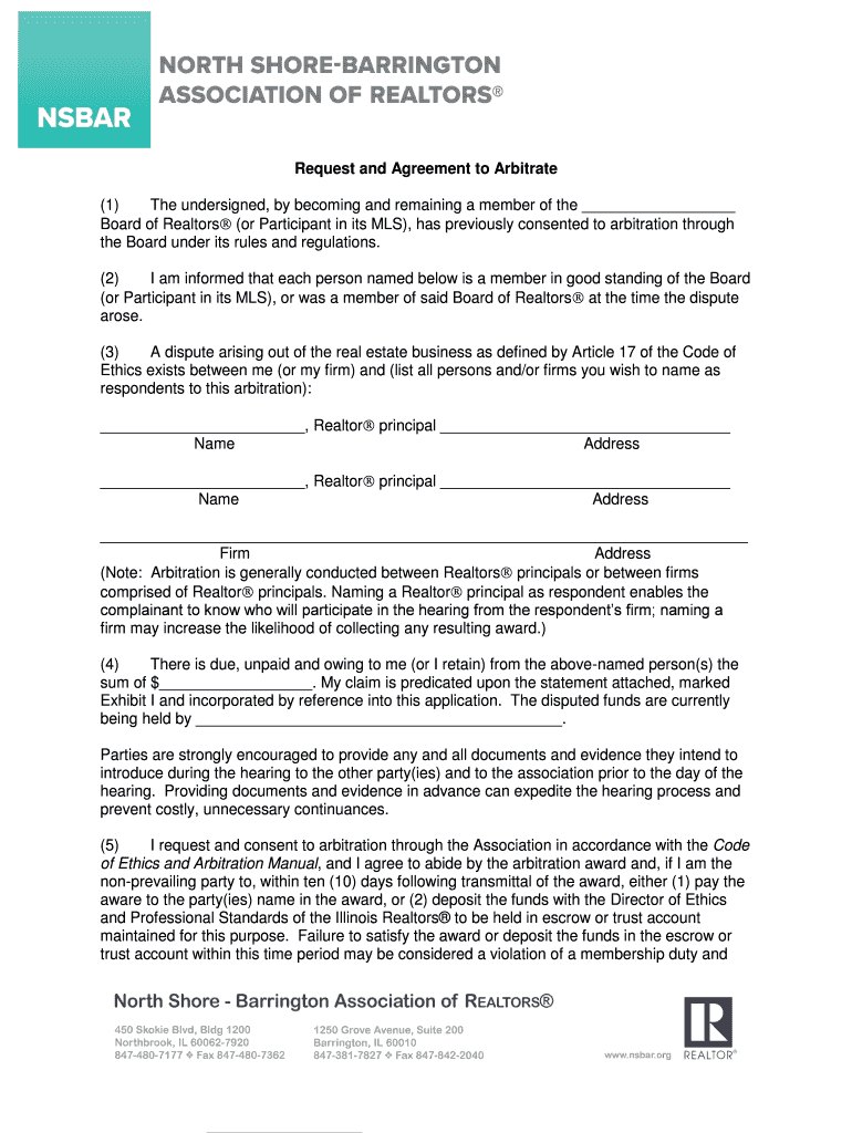 Request and Agreement to Arbitrate (1) The undersigned, by becoming and remaining a member of the Board of Realtors (or Participant in its MLS), has previously consented to arbitration through the