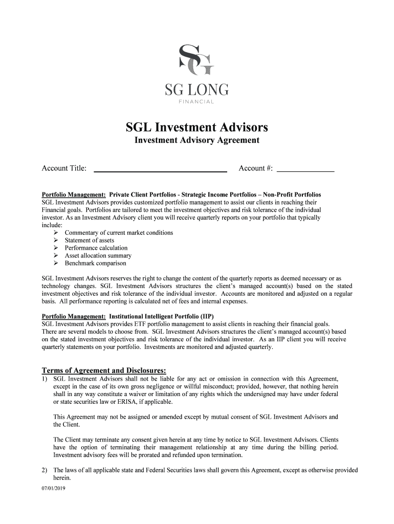 SGL Investment Advisors Investment Advisory Agreement Account Title:Account #:Portfolio Management: Private Client Portfolios Strategic Income Portfolios Nonprofit Portfolios SGL Investment Advisors