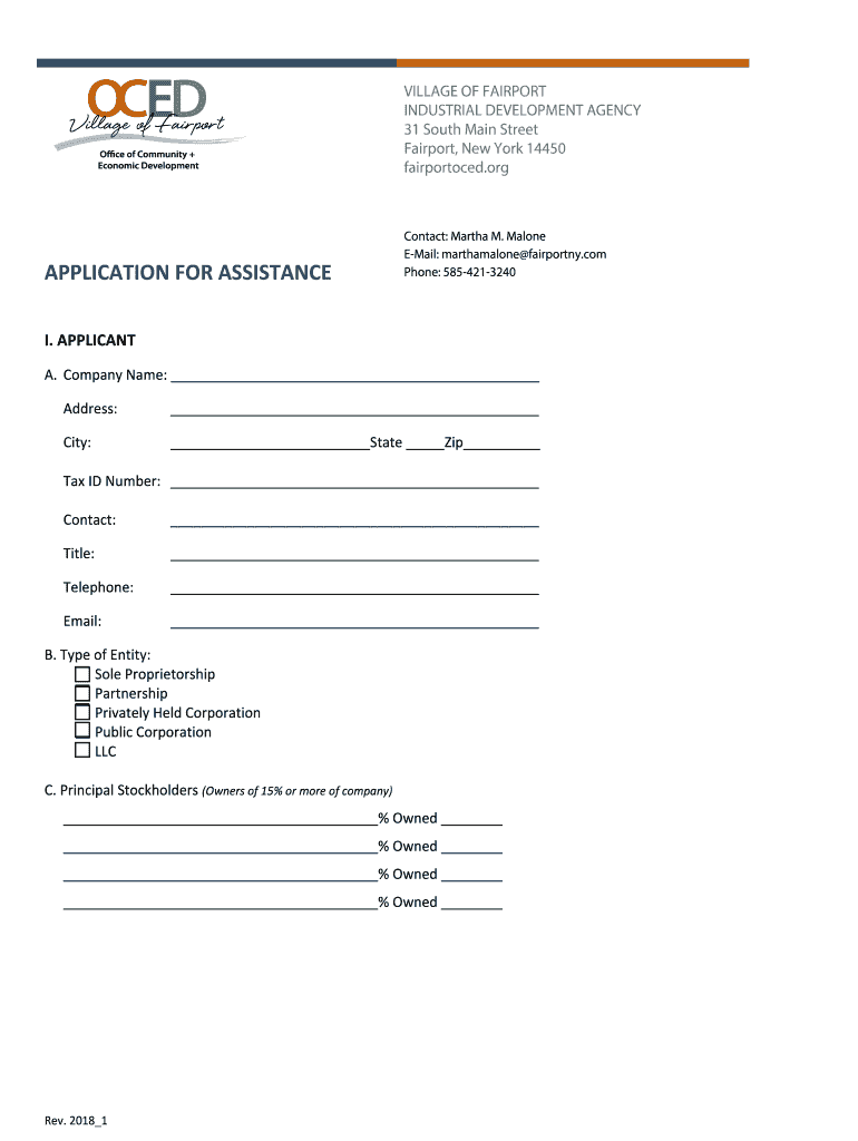VILLAGE OF AIRPORT INDUSTRIAL DEVELOPMENT AGENCY 31 South Main Street Airport, New York 14450 fairportoced.org Contact: Martha M. Malone Email: marthamalone fairportny.com Phone: 5854213240APPLICATIONFORASSISTANCE