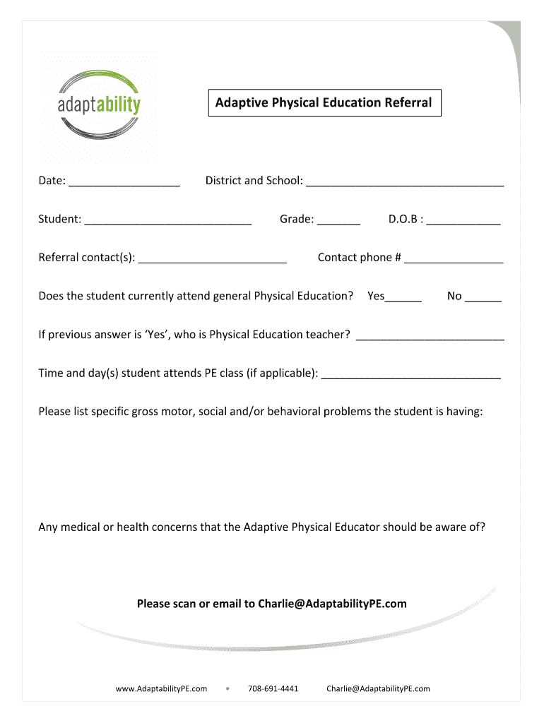 Adaptive Physical Education ReferralFormDate: District and School: Student: Grade: Referral contact(s): D.O.B : Contact phone # Does the student currently attend general Physical Education? Yes No