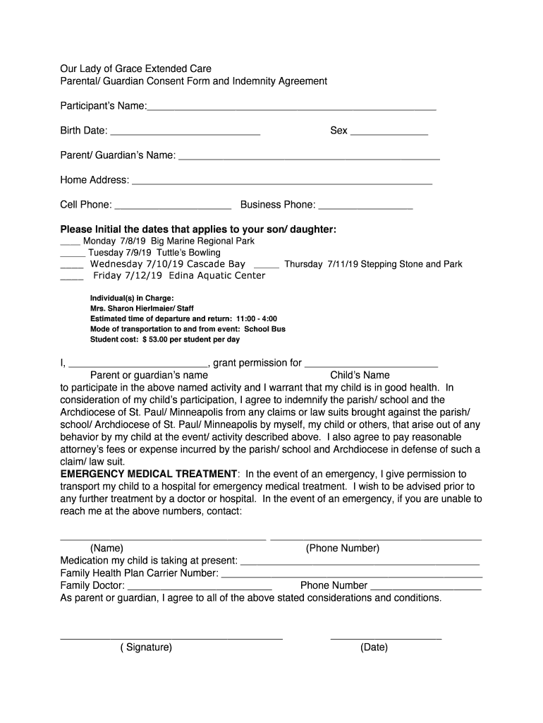 Our Lady of Grace Extended Care Parental/ Guardian Consent Form and Indemnity Agreement Participants Name: Birth Date: Sex Parent/ Guardians Name: Home Address: Cell Phone: Business Phone: Please