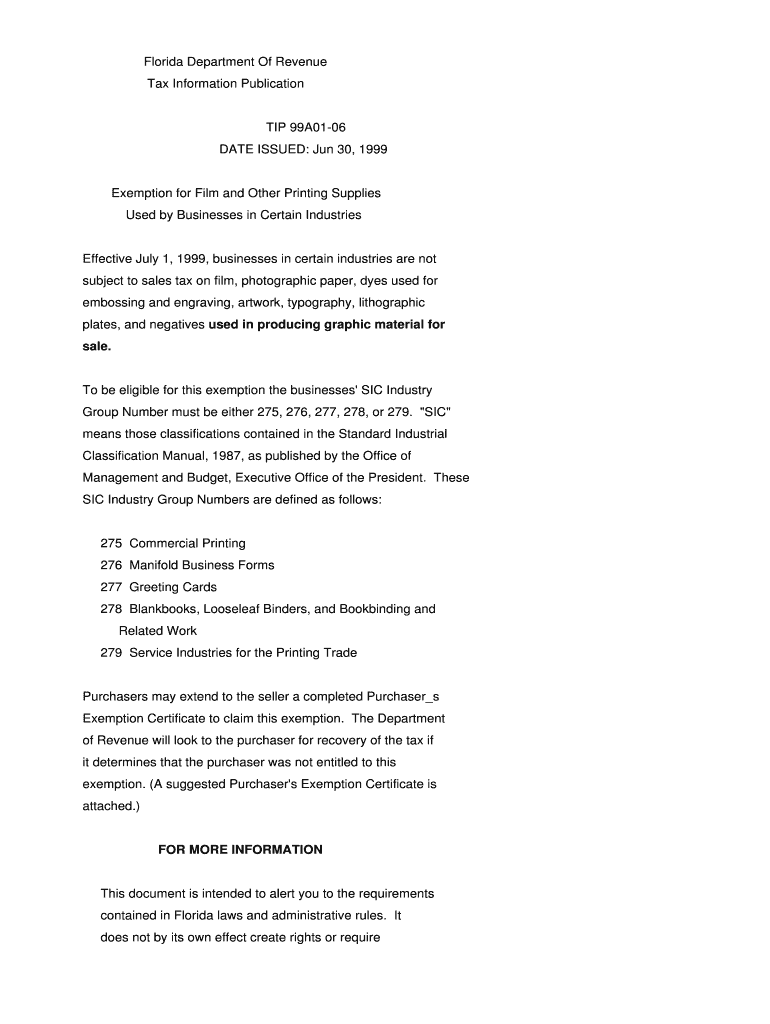 DATE ISSUED: Jun 30, 1999Exemption for Film and Other Printing Supplies
