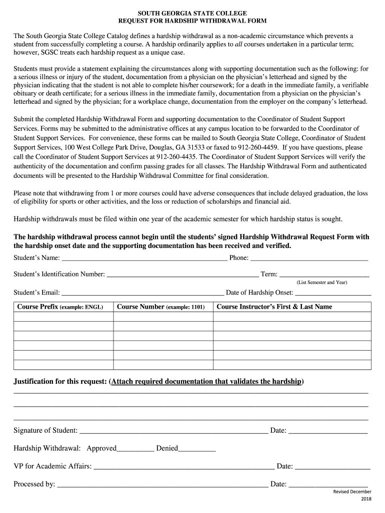 REQUEST FOR HARDSHIP WITHDRAWAL Forth South Georgia State College Catalog defines a hardship withdrawal as a nonacademic circumstance which prevents a