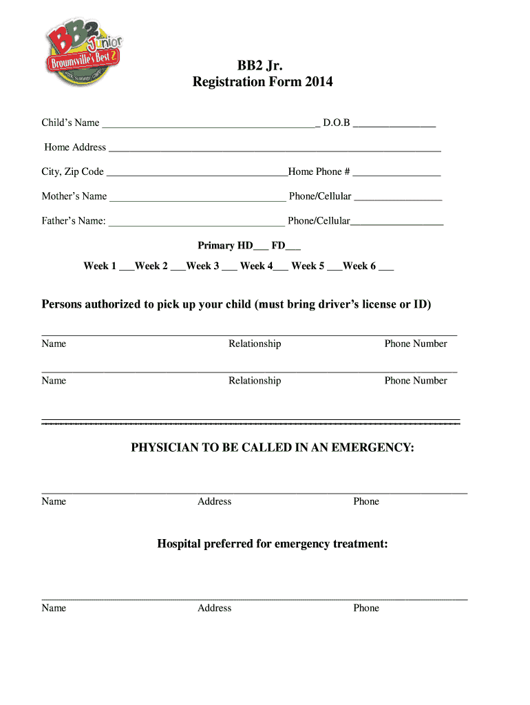 BB2 Jr. Registration Form 2014 Child's Name D.O.B Home Address City, Zip Code Home Phone # Mothers Name Phone/Cellular Fathers Name: Phone/Cellular Primary HD FD Week 1 Week 2 Week 3 Week 4 Week 5