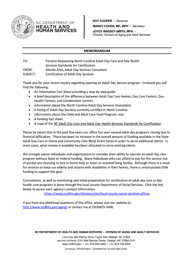 ROY COOPER Governor MANDY COHEN, MD, MPH Secretary JOYCE MASSEYSMITH, MPA Director, Division of Aging and Adult ServicesMEMORANDUM TO: FROM: SUBJECT:Persons Requesting North Carolina Adult Day Care