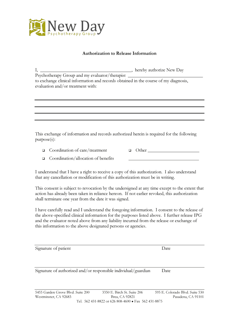 Authorization to Release Information I, hereby authorize New Day Psychotherapy Group and my evaluator/therapist to exchange clinical information and records obtained in the course of my diagnosis,