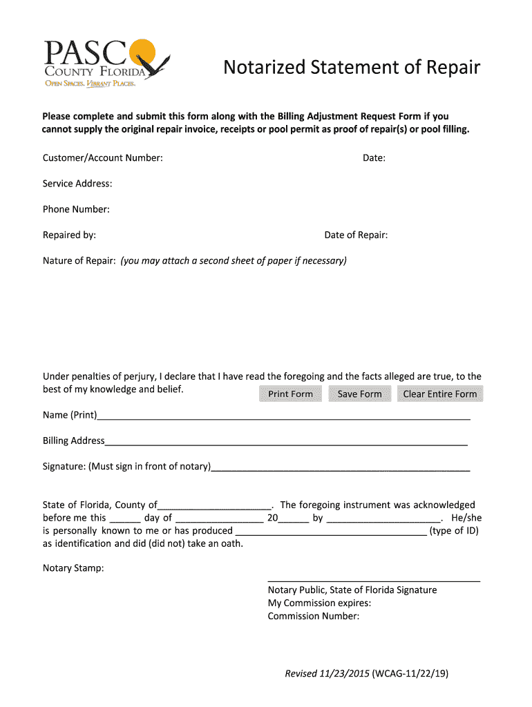 ACCOUNT FLORIDA OPEN SPACE’s. PLACES. Notarized Statement of RepairPlease complete and submit this form along with the Billing Adjustment Request Form if you cannot supply the original repair invoice,