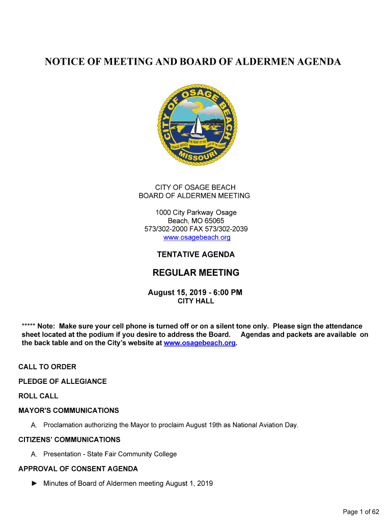 NOTICEOFMEETINGANDBOARDOFALDERMENAGENDACITYOFOSAGEBEACH