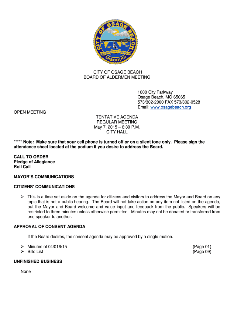 CITY OF OSAGE BEACH BOARD OF ALDERMEN MEETING1000 City Parkway Osage Beach, MO 65065 573/3022000 FAX 573/3020528 Email: www.osagebeach.org OPEN MEETING TENTATIVE AGENDA REGULAR MEETING May 7, 2015