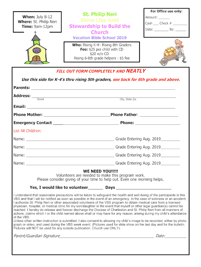 When: July 812 Where: St. Philip Nero Time: 9am12pmSt. Philip Nero Shine Like Gold Stewardship to Build the Churchgoer Office use only: Amount: Cash Check # Date: By: Vacation Bible School 2019 Who: