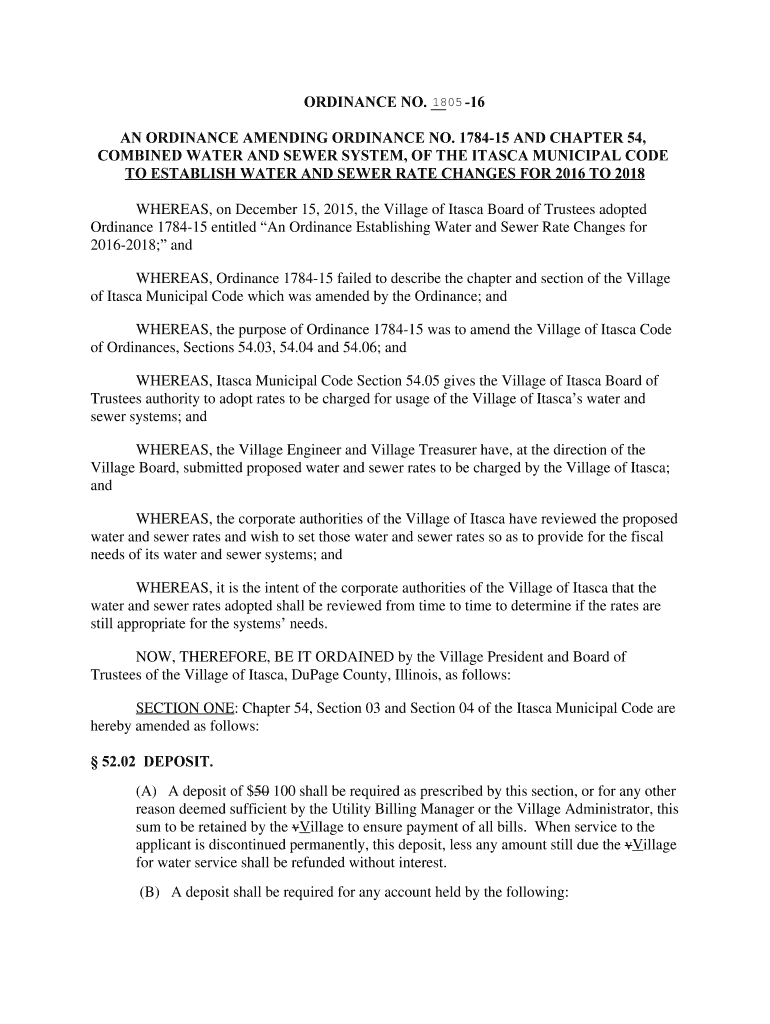 1805 16 Ordinances NO. AN ORDINANCE AMENDING ORDINANCE NO. 178415 AND CHAPTER 54, COMBINED WATER AND SEWER SYSTEM, OF THE ITASCA MUNICIPAL CODE TO ESTABLISH WATER AND SEWER RATE CHANGES FOR 2016 TO