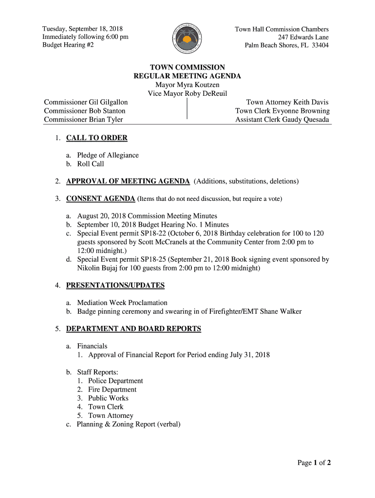 Tuesday, September 18, 2018, Immediately following 6:00 pm Budget Hearing #2Town Hall Commission Chambers 247 Edwards Lane Palm Beach Shores, FL 33404TOWN COMMISSION REGULAR MEETING AGENDA Mayor Myra