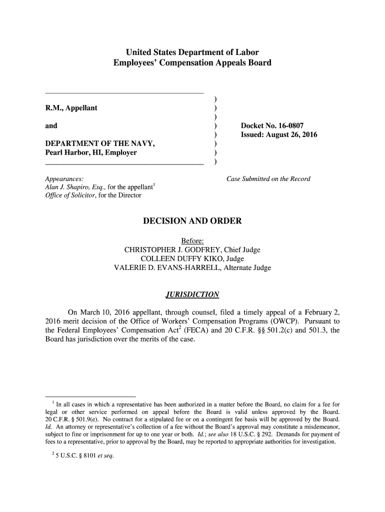 United States Department of Labor Employees Compensation Appeals Board R.M., Appellant and DEPARTMENT OF THE NAVY, Pearl Harbor, HI, Employer))))))))Appearances: Alan J. Shapiro, Esq., for the appellant1
