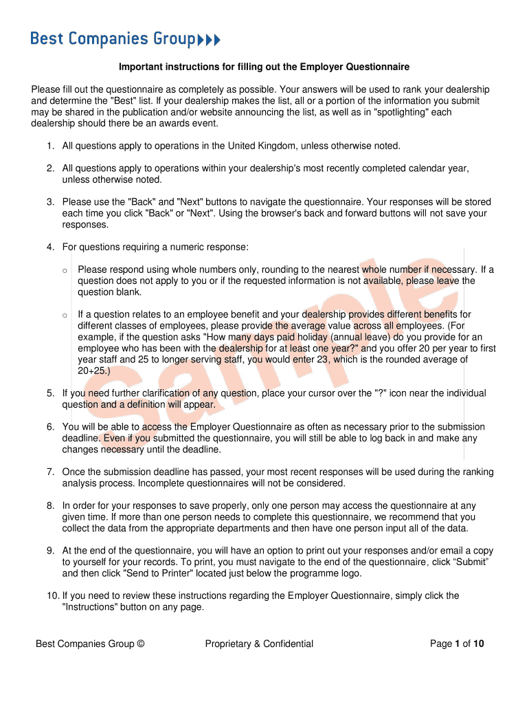 Important instructions for filling out the Employer Questionnaire Please fill out the questionnaire as completely as possible. Your answers will be used to rank your dealership and determine the “Best
