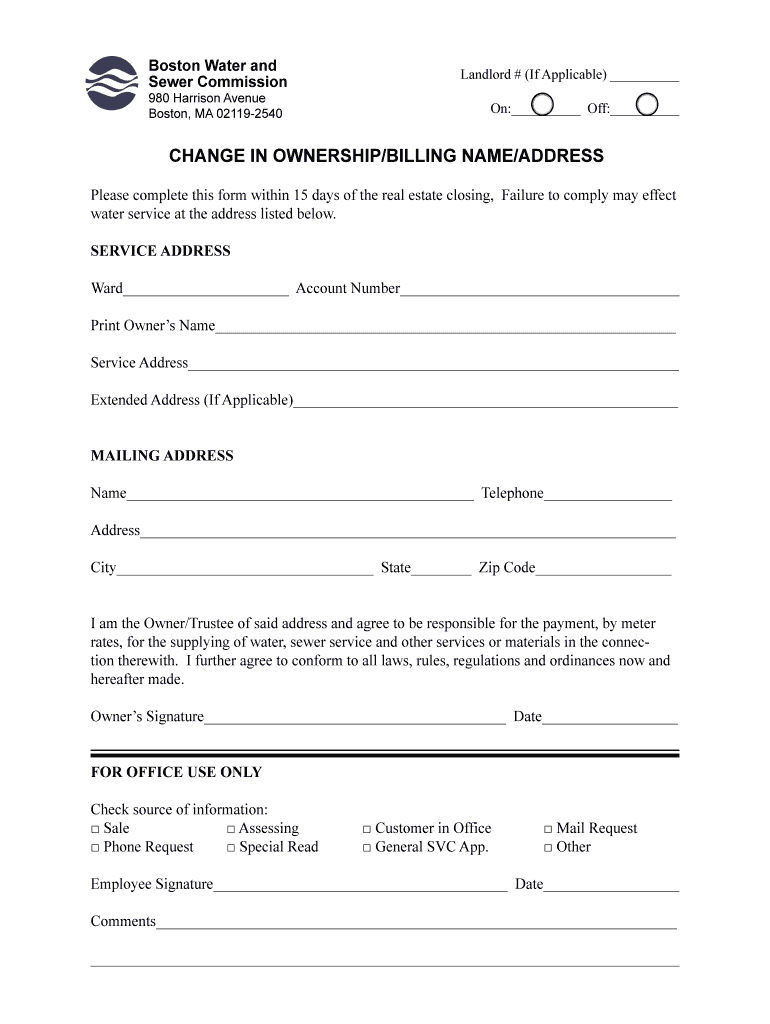 Boston Water and Sewer Commission 980 Harrison Avenue Boston, MA 021192540Landlord # (If Applicable) On: Off: CHANGE IN OWNERSHIP/BILLING NAME/ADDRESS Please complete this form within 15 days of the