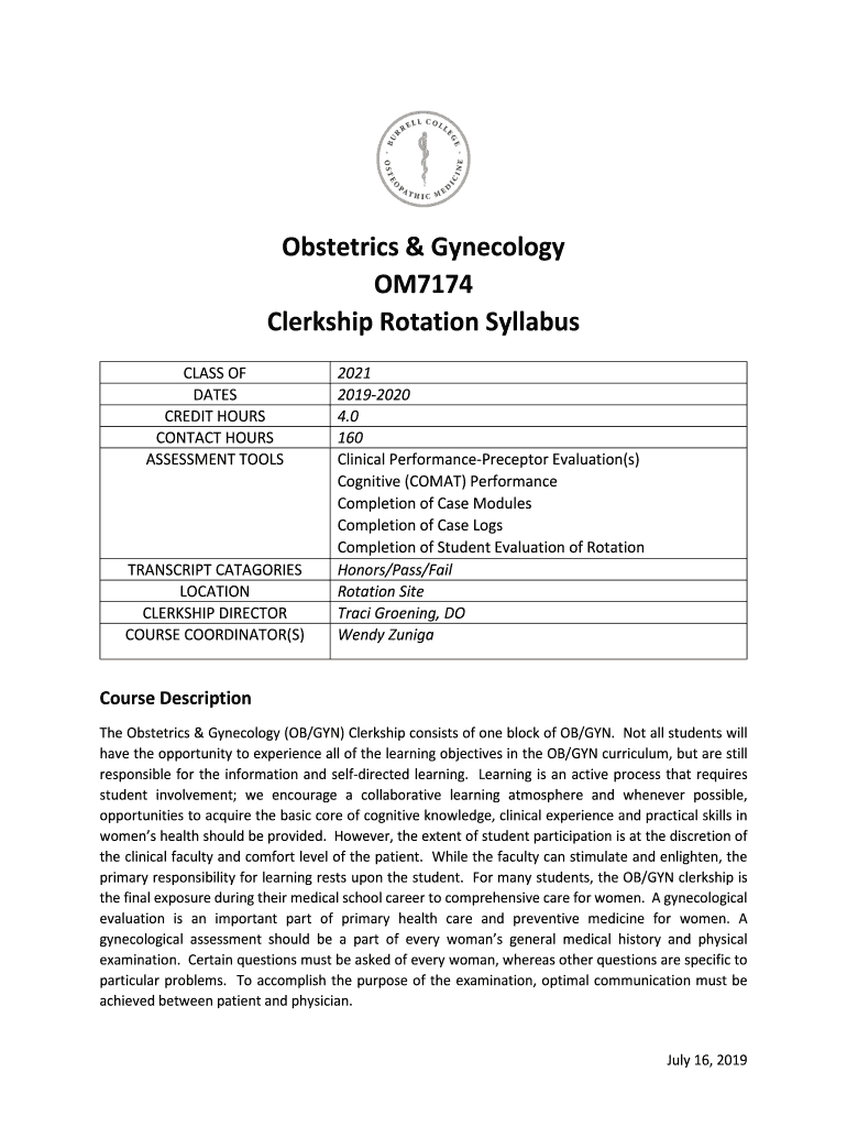 Obstetrics & Gynecology OM7174 Clerkship Rotation Syllabus CLASS OF DATES CREDIT HOURS CONTACT HOURS ASSESSMENT TOOLSTRANSCRIPT CATEGORIES LOCATION CLERKSHIP DIRECTOR COURSE COORDINATOR(S)2021 20192020