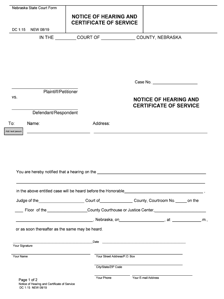 Nebraska State Court Formative OF HEARING AND CERTIFICATE OF SERVICERESET FORM DC 1:15NEW 08/19IN THE COURT OF COUNTY, NEBRASKA Chooses the countyChoose the courtly of Case Check only one:ProbateAdoptionCivil,
