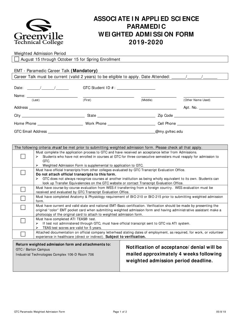 ASSOCIATE IN APPLIED SCIENCE PARAMEDIC WEIGHTED ADMISSION FORM 20192020 Weighted Admission Period August 15 through October 15 for Spring Enrollment EMT Paramedic Career Talk (Mandatory) Career Talk