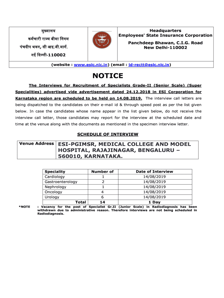 Headquarters Employees State Insurance Corporation Sandeep Shawn, C.I.G. Road New Delhi110002,... 110002(website : www.esic.nic.in) (email : direct Eric.NIC.in)NOTICE The Interviews for Recruitment