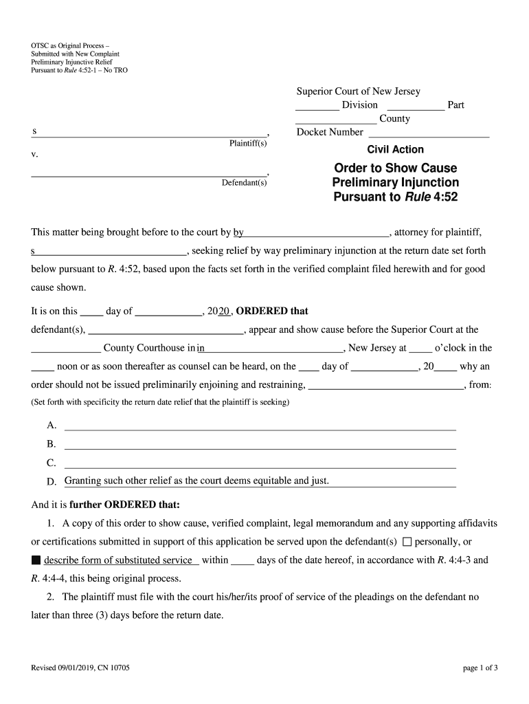 Saves as Original Process Submitted with New Complaint Preliminary Injunctive Relief Pursuant to Rule 4:521 No Bros, Print Superior Court of New Jersey Division County Docket NumberPlaintiff(s)ClearPartCivil