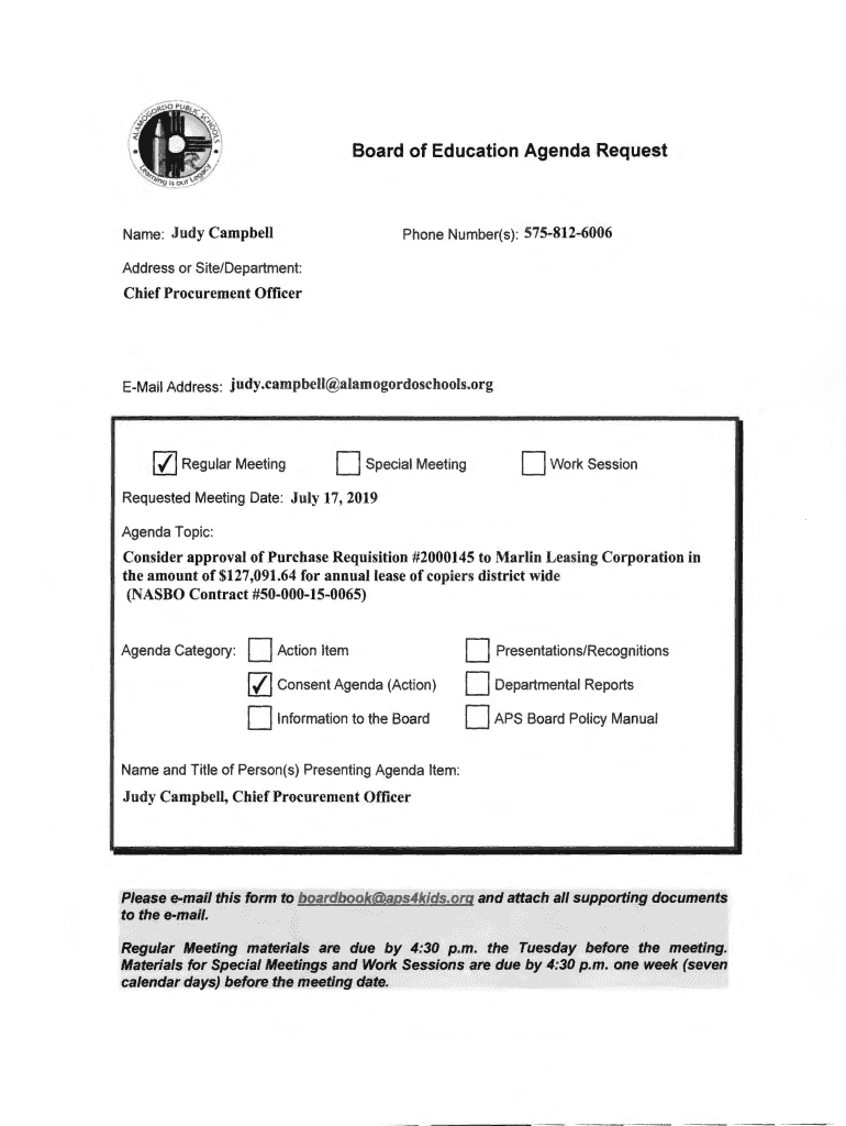 Board of Education Agenda Sequestrate: Judy CampbellPhone Number(s): 5758126006Address or Site/Department:Chief Procurement OfficerEMail Address: Judy. Campbell×alamogordoschools.corgi./ Regular