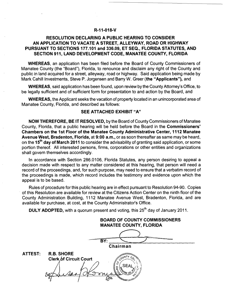 R11018V RESOLUTION DECLARING A PUBLIC HEARING TO CONSIDER AN APPLICATION TO VACATE A STREET, ALLEYWAY, ROAD OR HIGHWAY PURSUANT TO SECTIONS 177.101 and 336.09, ET SEQ., FLORIDA STATUTES, AND SECTION