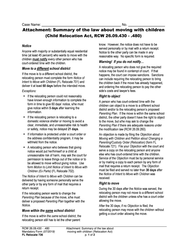 Case Name:No. Attachment: Summary of the law about moving with children (Child Relocation Act, RCW 26.09.430 .480) Notice Anyone with majority or substantially equal residential time (at least 45