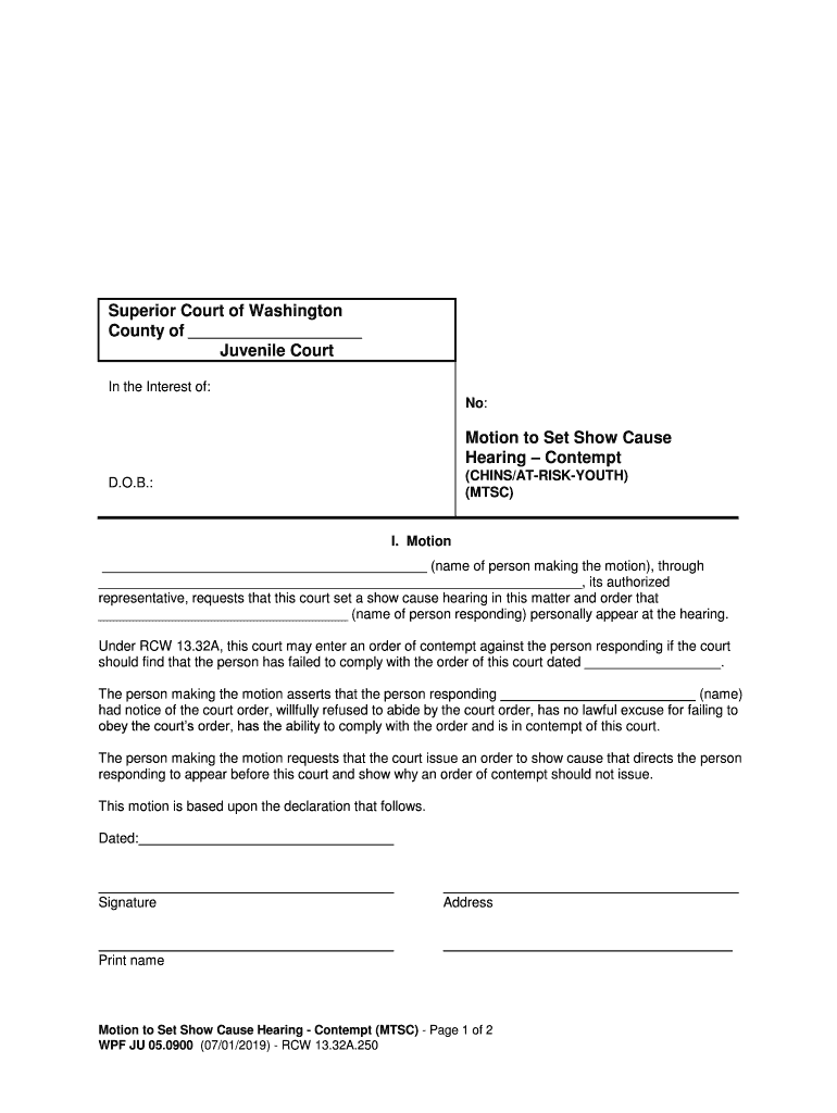 Superior Court of Washington County of Juvenile Court In the Interest of: No:Motion to Set Show Cause Hearing Contempt (CHINS/ATRISKYOUTH) (MSC)D.O.B.:I. Motion (name of person making the motion),