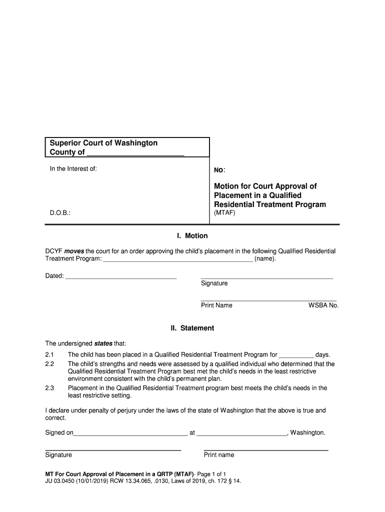 Superior Court of Washington County of In the Interest of:No:Motion for Court Approval of Placement in a Qualified Residential Treatment Program (MTA)D.O.B.:I. Motion DCF moves the court for an order