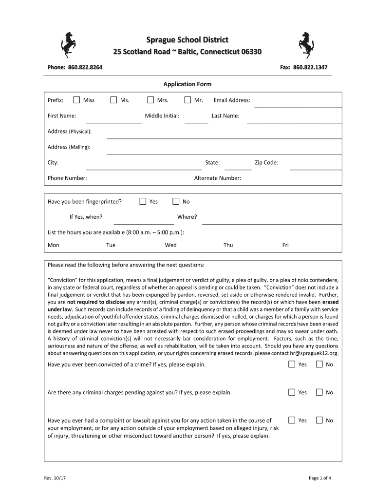 Prague School District 25 Scotland Road Baltic, Connecticut 06330 Phone: 860.822.8264Fax: 860.822.1347Application Form Prefix:Misses. First Name:Mrs. Mr. Email Address:Middle Initial:Last Name:Address