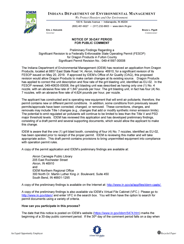 IN DIANA D DEPARTMENT OF E ENVIRONMENTAL M MANAGEMENT We Protect Hoosiers and Our Environment. 100 N. Senate Avenue Indianapolis, IN 46204 (800) 4516027 (317) 2328603 www.idem.IN.gov Eric J. Holcomb