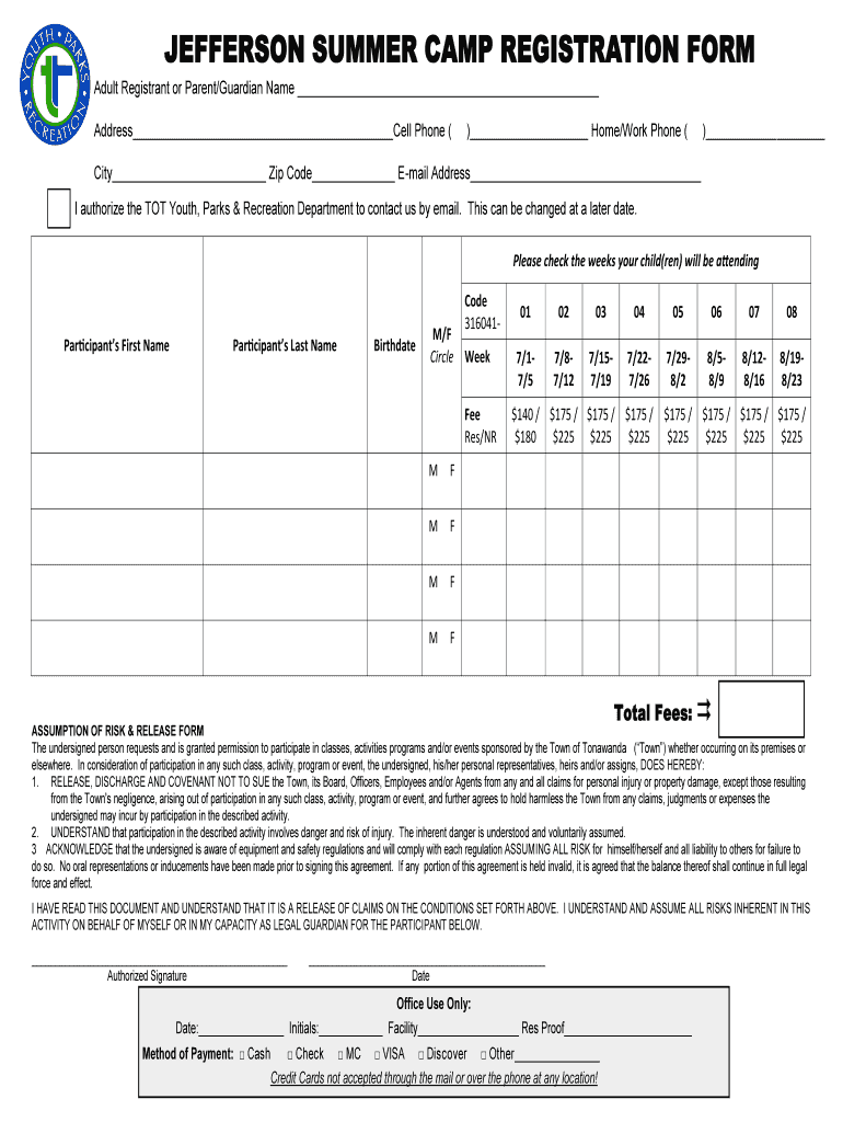 JEFFERSON SUMMER CAMP REGISTRATION FORM Adult Registrant or Parent/Guardian Name Address Cell Phone () Home/Work Phone () City Zip Code Email Address I authorize the TOT Youth, Parks & Recreation