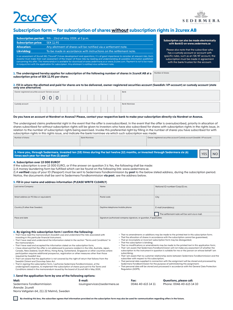 Subscription form for subscription of shares without subscription rights in 2curex AB Subscription period: Subscription price: Allocation: Likviddag:9th 23rd of May 2019, at 3 p.m. SEK 11.95 Any allotment