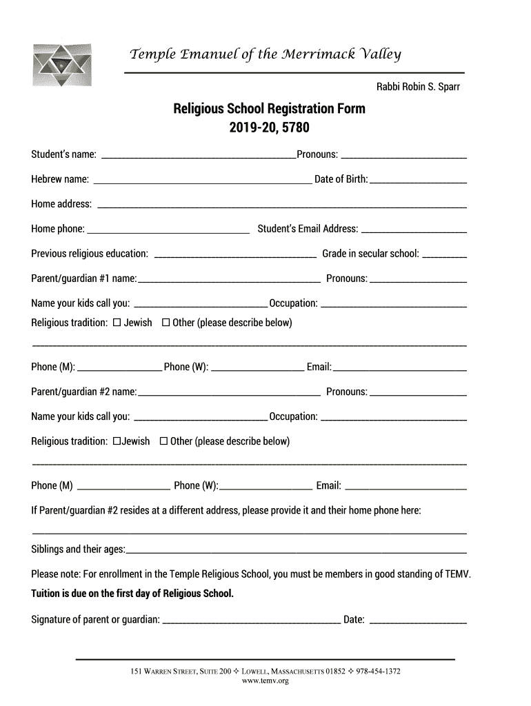 Temple Emanuel of the Merrimack Valley Rabbi Robin S. SparrReligious School Registration Form 201920, 5780 Students name: Pronouns: Hebrew name:Date of Birth: Home address: Home phone:Students Email