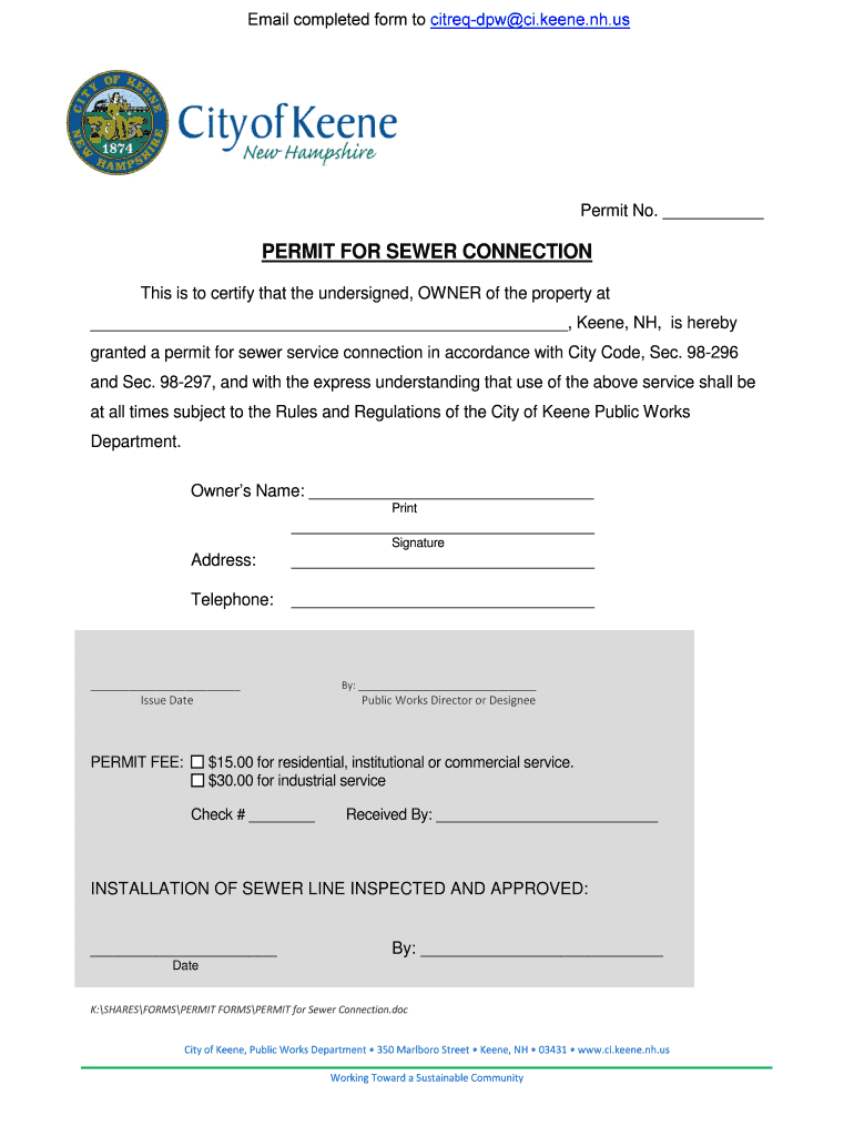 Email completed form to citreqdpw CI.keen.NH.permit No. PERMIT FOR SEWER CONNECTION This is to certify that the undersigned, OWNER of the property at, Keen, NH, is hereby granted a permit for sewer