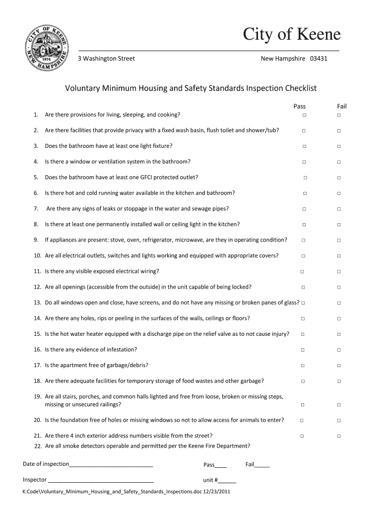 3 Washington Street Hampshire 03431Voluntary Minimum Housing and Safety Standards Inspection Checklist