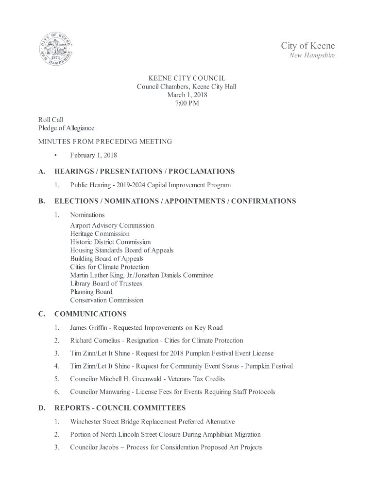 City of Keen New Hampshire KEEN CITY COUNCIL Chambers, Keen City Hall March 1, 2018 7:00 PM Roll Call Pledge of Allegiance MINUTES FROM PRECEDING MEETING A.HEARINGS / PRESENTATIONS / PROCLAMATIONS