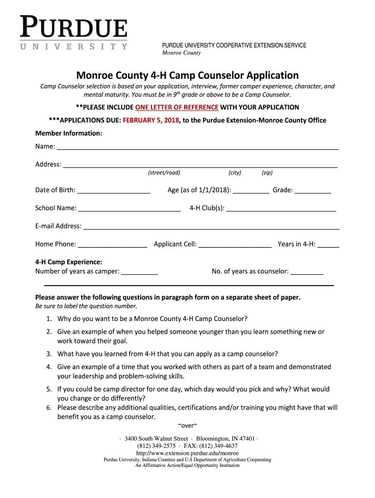 PURDUE UNIVERSITY COOPERATIVE EXTENSION SERVICE Monroe County 4H Camp Counselor ApplicationCamp Counselor selection is based on your application, interview, former camper experience, character, and