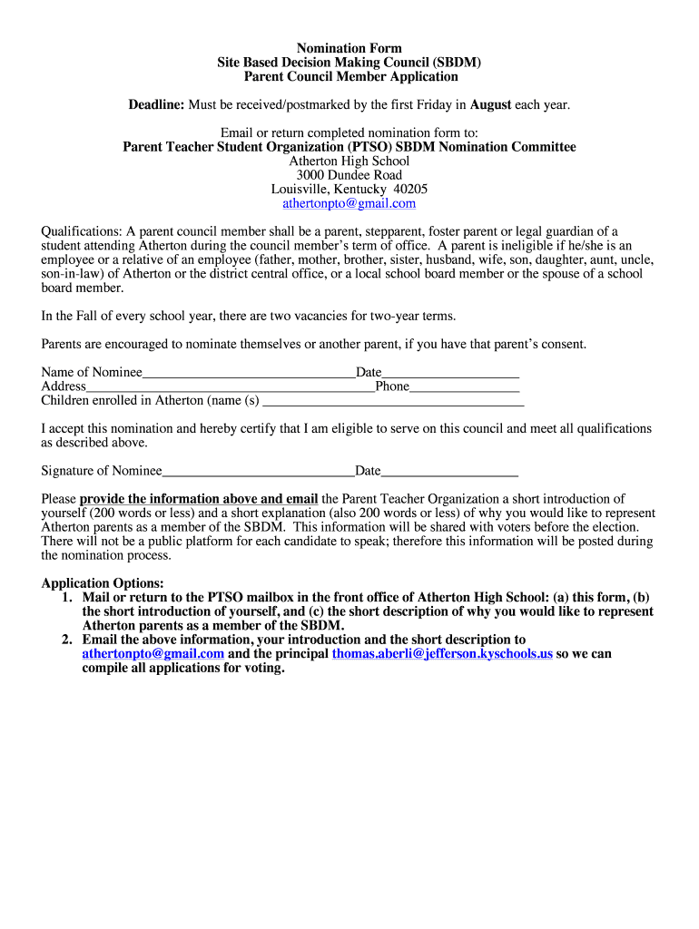 Get the free Nomination Form Parent Council Member Application Deadline ... - schools jefferson k...