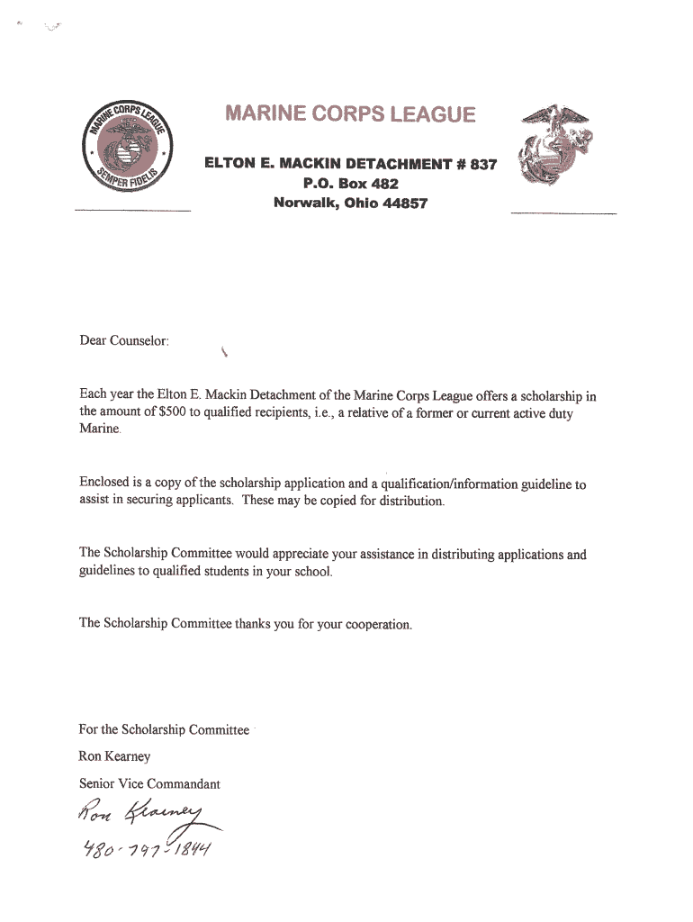 Norwalk, OHI 44857Dear Counselor:Each year the Elton E. Mac kin Detachment of the Marine Corps League offers a scholarship in