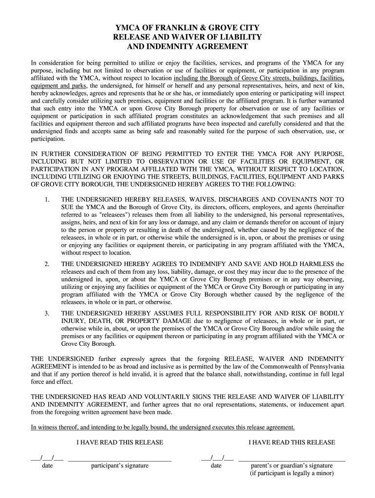YMCA OF FRANKLIN & GROVE CITY RELEASE AND WAIVER OF LIABILITY AND INDEMNITY AGREEMENT In consideration for being permitted to utilize or enjoy the facilities, services, and programs of the YMCA for