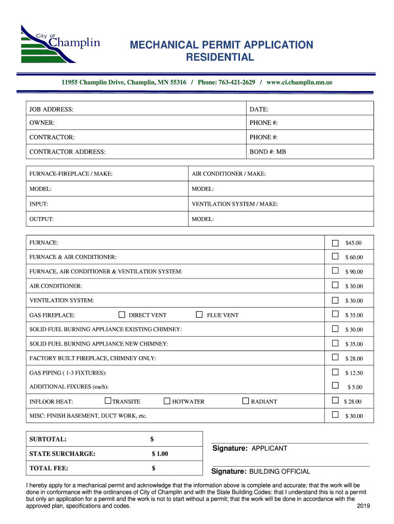 MECHANICAL PERMIT APPLICATION RESIDENTIAL 11955 Champlain Drive, Champlain, MN 55316 / Phone: 7634212629 / www.ci.champlin.mn.usJOB ADDRESS:DATE:OWNER:PHONE #:CONTRACTOR:PHONE #:CONTRACTOR ADDRESS:BOND