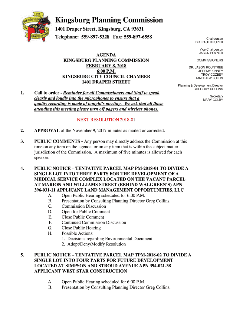 Kings burg Planning Commission 1401 Draper Street, Kings burg, CA 93631 Telephone: 5598975328 Fax: 5598976558AGENDA GINSBURG PLANNING COMMISSION FEBRUARY 8, 2018 6:00 P.M. GINSBURG CITY COUNCIL CHAMBER