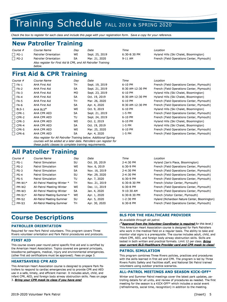 Training ScheduleFALL 2019 & SPRING 2020Check the box to register for each class and include this page with your registration form. Save a copy for your reference. New Patroller Training Course #Course