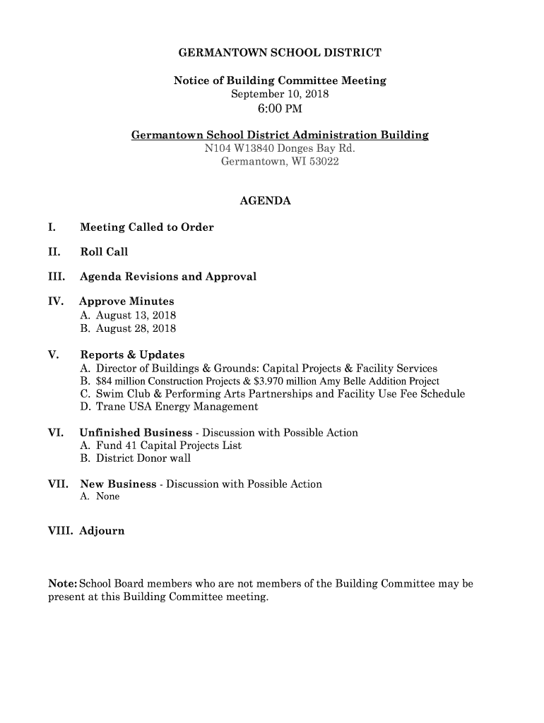 GERMANTOWN SCHOOL DISTRICT Notice of Building Committee Meeting September 10, 2018 6:00 PM Germantown School District Administration Building N104 W13840 Dodges Bay Rd. Germantown, WI 53022 AGENDA