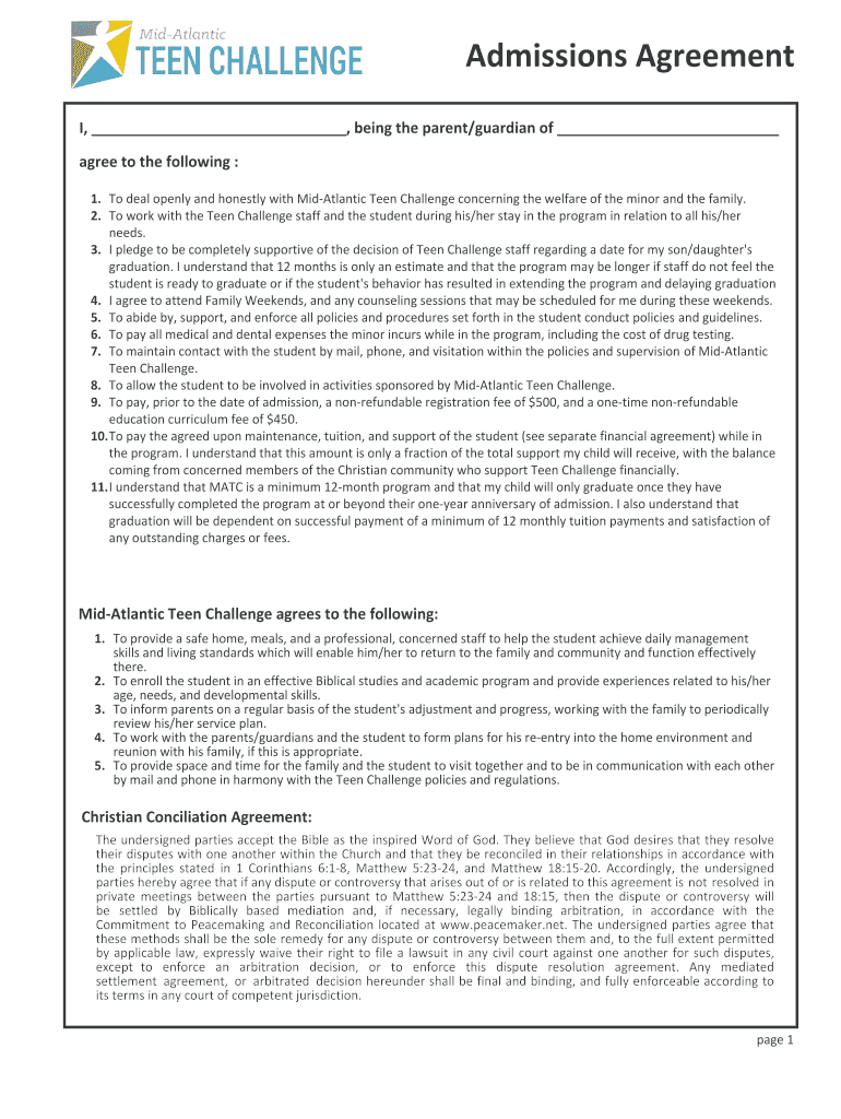Get the free Admissions Agreement - Mid-Atlantic Teen Challenge